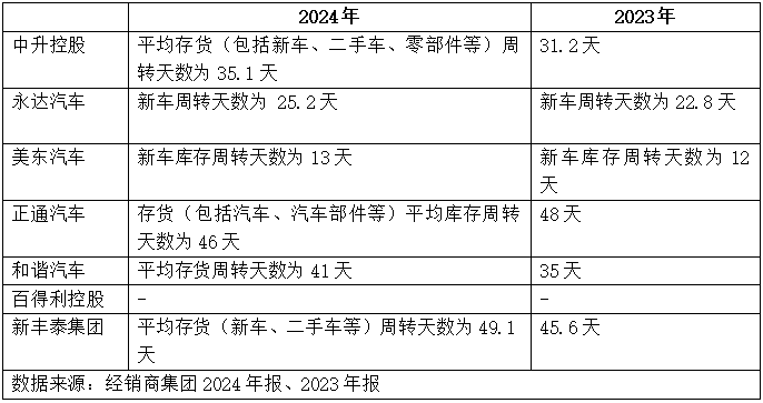 以头部汽车经销商集团公布的年报数据看,7家汽车经销商集团中,有5家2024年平均存货周转天数或新车周转天数较2023年有所增长。