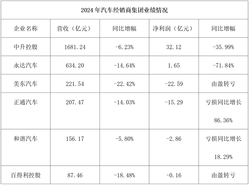 已发布2024年报的7家汽车经销商集团中,排在第一的中升控股2024年营收1681.24亿元,同比下降6.2%。另外6家里,和谐汽车营收同比下降5.8%,其余经销商下滑幅度均在两位数以上。