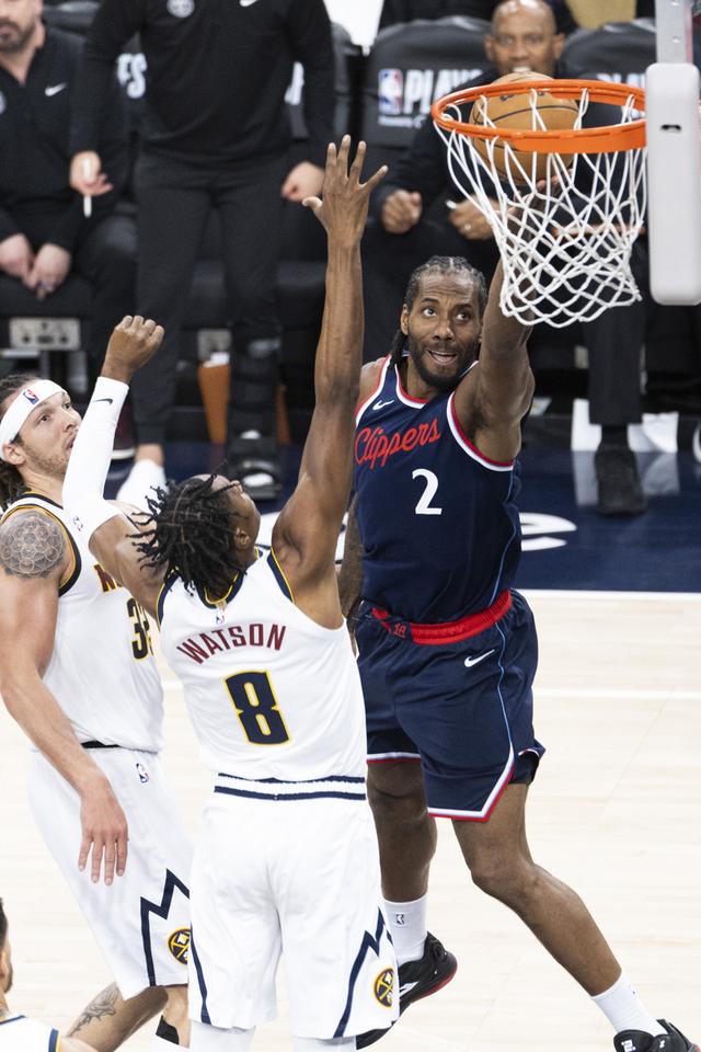 新华社照片,洛杉矶(美国),5月1日,快船队球员科怀·伦纳德(右)在比赛中上篮。 当日,在2024-2025赛季NBA季后赛首轮比赛中,洛杉矶快船队主场111比105战胜丹佛掘金队,总比分3比3战平。 新华社发(赵汉荣摄)