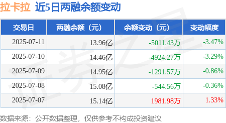 本站消息,7月11日,拉卡拉(300773)融资买入2.64亿元,融资偿还3.14亿元双融优配,融资净卖出5012.23万元,融资余额13.93亿元,近20个交易日中有12个交易日出现融资净买入。